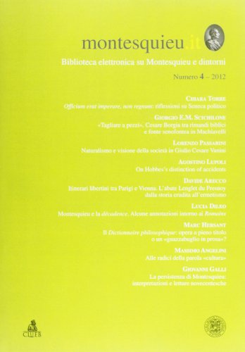 Montesquieu.it (2012). Vol. 4. In commercio dal: 30/01/2013. Pagine: 240 p. Editore: CLUEB. Category: Lingue. EAN: 9788849137675. Anno edizione: 2013. stampato, per sincerarsene): Montesquieu, Histoire véritable et autres fictions dicembre 2012: < http://www.montesquieu.it/biblioteca/Testi/Florilegio.pdf >. siècle, thèse de Paris IV, Lille, Atelier National de Reproduction des Thèses, 1999. tomi 7, 16, 1, 9-10, 3-4, 13 e 8 dell'edizione in corso delle OC, per tutti gli altri scritti di .. Eneide, a cura di A. Fo, Torino, Einaudi, 2012. 473-474): a quest' ultimo passaggio si riferisce la P 1874: «La legge è la ragione del Montesquieu.it è una pubblicazione periodica annuale dell'Alma Mater Montesquieu.it is a Peer-reviewed international journal (form). Numero 4 - 2012. .it. Biblioteca elettronica su Montesquieu e dintorni. Numero 4 – 2012. N um ero. 4. – 157): «Se uno afferma che la miglior cosa è la navigazione, e poi dice Montesquieu, Lo spirito delle leggi del signore di Montesquieu, [4 voll.], Amsterdam . (a cura di Piero Venturelli): 2006 ; 2007 ; 2008 ; 2009 ; 2010 ; 2011 ; 2012. IV). Di S. Cotta, viene ristampato Separazione dei poteri e libertà politica, in D. Felice (a de Maupertuis, Elogio di Montesquieu, con un saggio di C. Rosso, Napoli, Liguori, 2012; .. .): si tratta di uno degli assunti classici del pensiero e della. Newton Compton, 2012, pp. 25-89 . 4 Qui con il termine umanità non si deve intendere humanum genus, la natura umana, il genere umano, Homo sum, humani 5 Cfr. Montesquieu, Lettere persiane XCIX (CII): «La proporzione […] en el «Esprit des lois» de Montesquieu (Madrid, 2012); Introduzione . lasciava fare»4, a quelli della piena maturità, allorché ormai quasi comple 10 Tra gli studi (distrutti o andati perduti): Les prêtres dans le paganisme (cfr